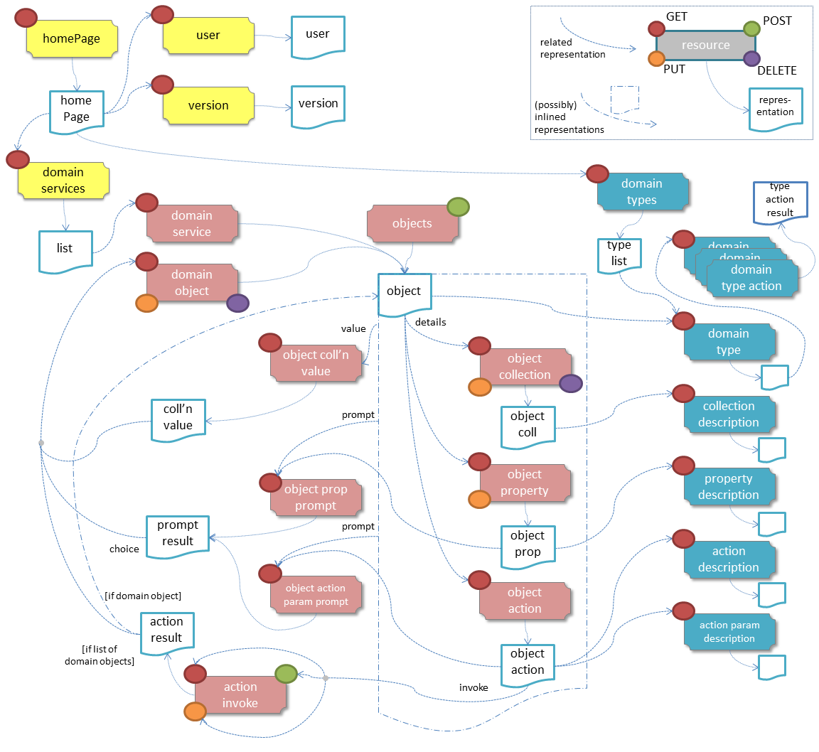The diagram below - taken from the Restful Objects spec - shows the various resources (URLs) and representations (JSON) that are defined: