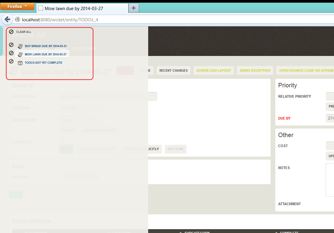 describedAs()The describedAs() attribute is used to provide a short description of the view model to the user. In the Wicket viewer it is displayed as a 'tool tip'. The describedAs() attribute can also be specified for collections, properties, actions, parameters and domain objects.