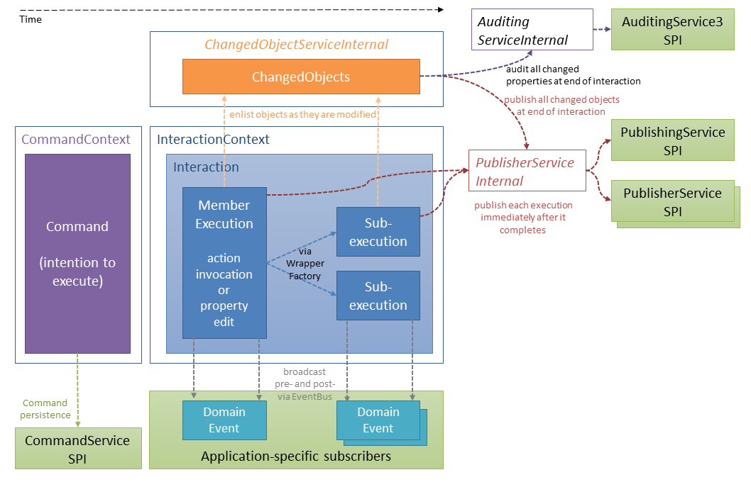 A good number of the domain services manage the execution of action invocations/property edits, along with the state of domain objects that are modified as a result of these. These services capture information which can then be used for various purposes, most notably for auditing or for publishing events, or for deferring execution such that the execution be performed in the background at some later date.